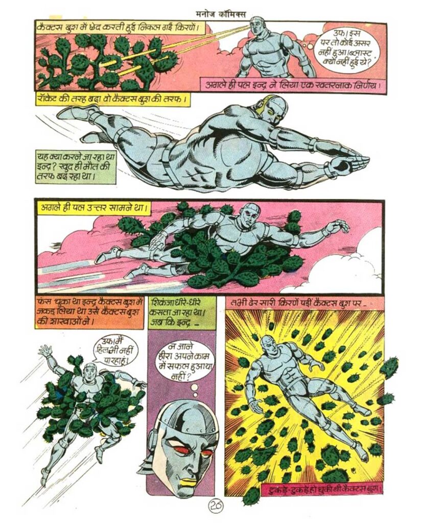 90’s Truly, between Raj Comics and Diamond Comics, Manoj Comics had created a distinct and special identity for itself. Indra is one of the most popular and powerful heroes of this publication. Indra is a great man whose body is made of shining metal like silver and whose powers rest on solar energy and advanced technology. Today, we will review in detail a very interesting story of Indra, ‘Cactus’. The comic is not limited to just action and adventure, but also features espionage, science, and social issues, especially the drug problem, as part of the story.