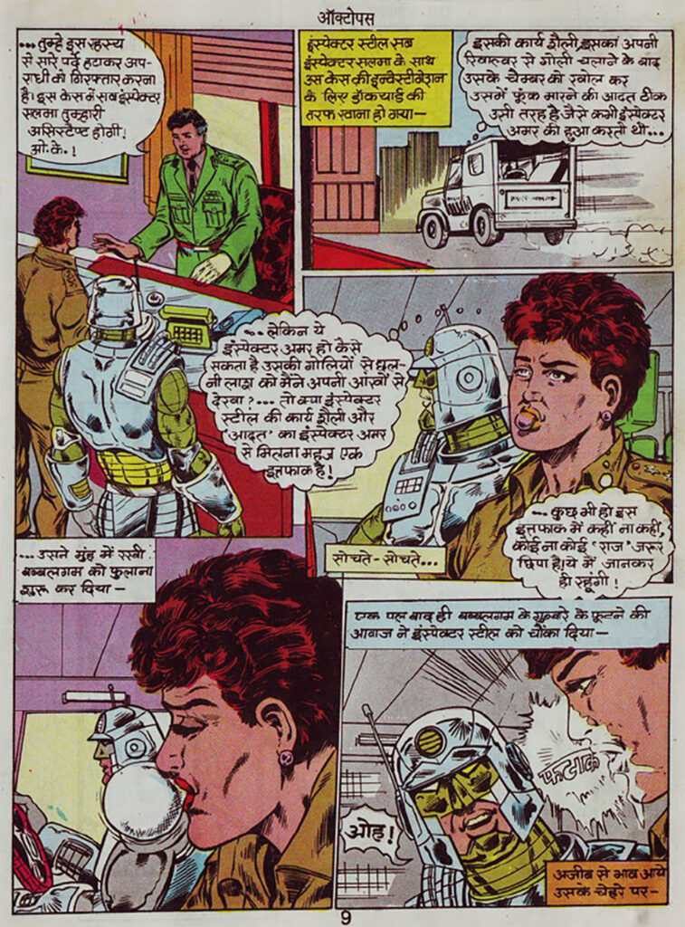 If you’re a fan of 90s Indian comics, “Octopus” is a must-read for you. It presents Inspector Steel in his finest form—a fearless keeper of the law, made of iron on the outside but humanity on the inside, i.e., ‘gold’. The pairing of Salma and Steel makes it stand out and feel stronger than most solo comics.