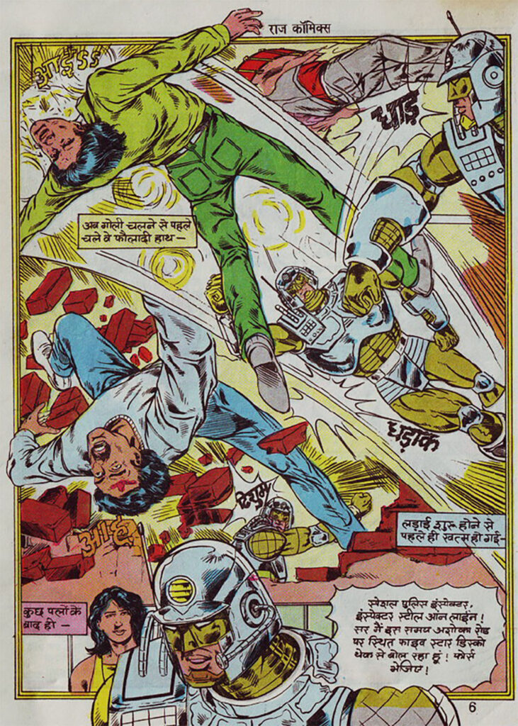 The story then moves to the ‘Five Star Discotheque’, a noble area of the city. Here, the author also takes a slight dig at society, showing how crime is no longer limited to slums only, but is also comfortably taking shelter in rich areas. Outside the discotheque, a nervous woman bumps into Inspector Steel. Steel, who appears as a man with a huge machine body, still listens to her in a very calm and polite manner and tries to understand her problem.