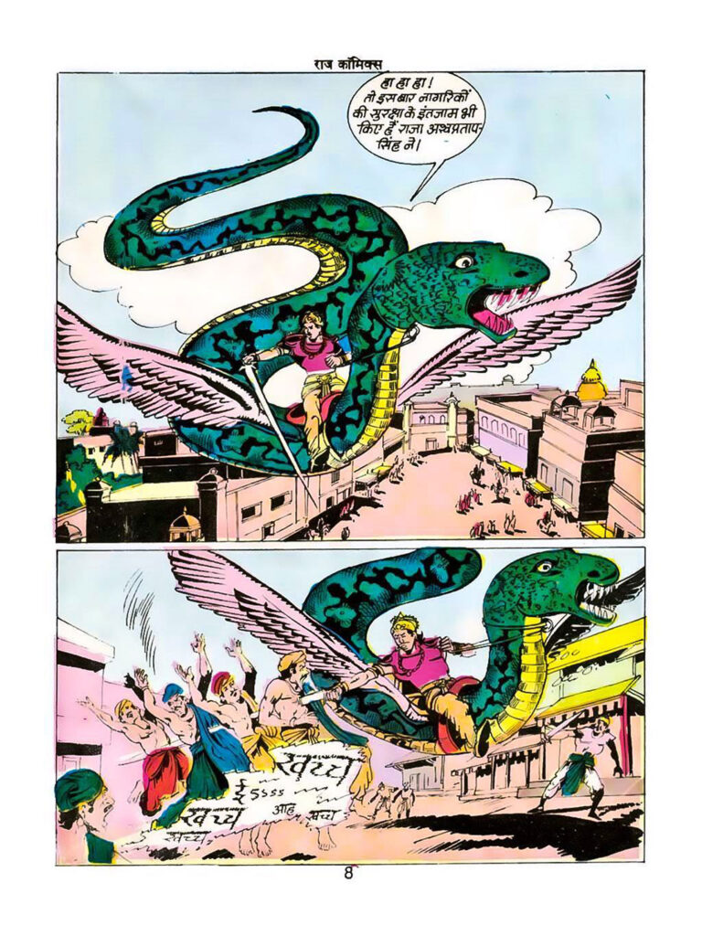 The spectacular design of flying horses and especially winged flying snakes deepens Digvijay’s scary image. Emotions like anger, fear, sadness, and bravery are engraved on the faces of the characters in a very clear and impressive manner—Digvijay’s cruel smile and King Ashvapratap’s helplessness have been captured brilliantly by the artist. Bright colors like red, blue, and green give the whole story a strong fantasy atmosphere, seeing which the same old comics magic is felt again.