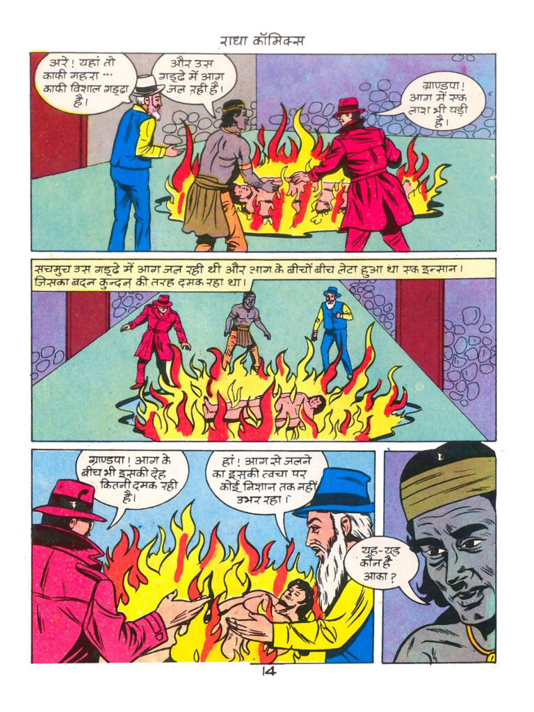 जैसे-जैसे वे आगे बढ़ते हैं, गर्मी का अहसास होता है। और फिर, वे एक अद्भुत दृश्य देखते हैं। एक आग का गड्ढा (Fire Pit), जिसमें लपटें उठ रही हैं, और उन लपटों के बीच एक इंसान सो रहा है। उसका शरीर कुंदन की तरह चमक रहा है। यह दृश्य भारतीय कॉमिक्स के सबसे प्रतिष्ठित दृश्यों में से एक हो सकता है।