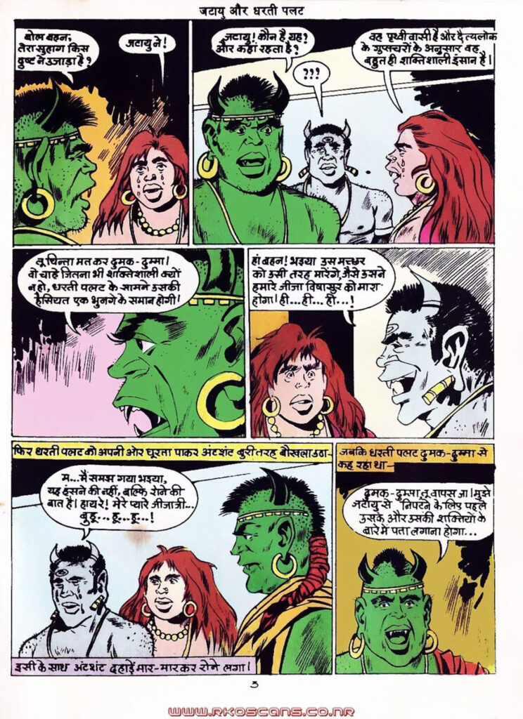 The story begins in Hades, which has been a well-known and favorite setting in comics of that period. Here we see Dumak-Dumma, the wife of a demon named Vishasura, crying. She reaches her brother, the demon king Dharti Palat, and pleads for revenge. Dumak-Dumma tells him that Jatayu, a brave warrior of Prithvi Loka, has killed her husband Vishasura and made her a widow.
