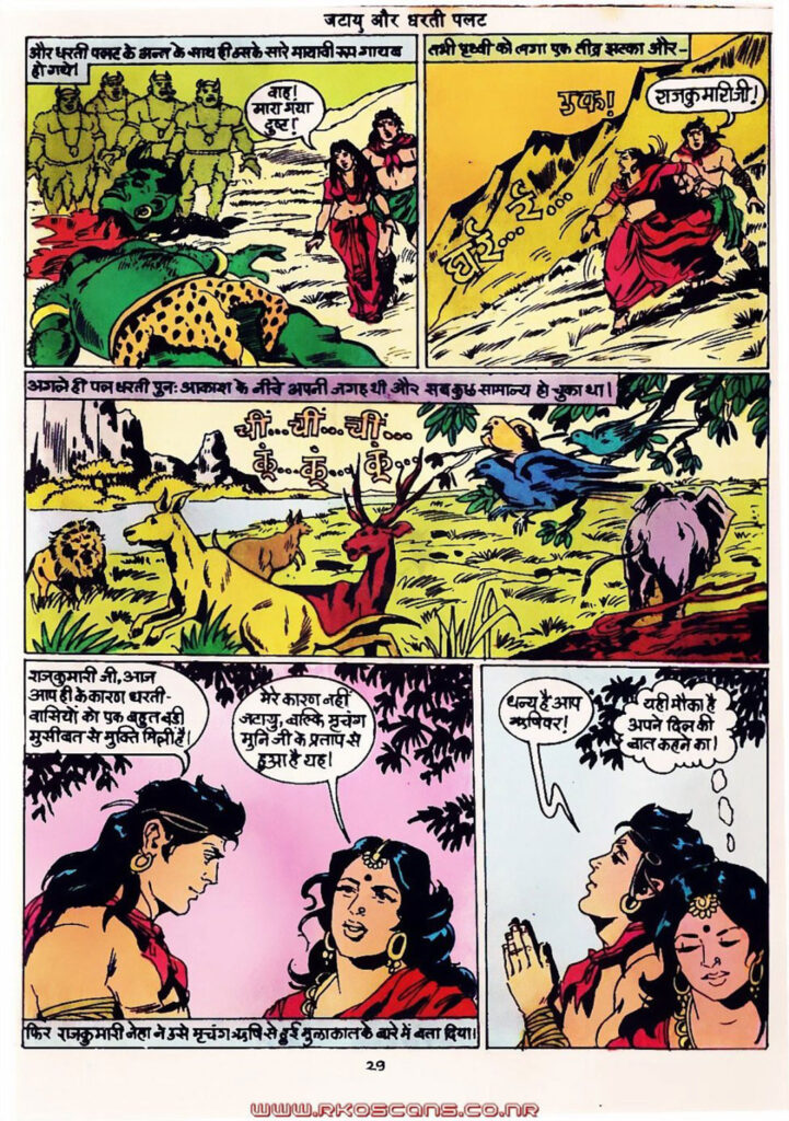 कहानी की शुरुआत पाताल लोक से होती है, जो उस दौर की कॉमिक्स का एक जाना-पहचाना और पसंदीदा हिस्सा रहा है। यहाँ हम विषासुर नाम के राक्षस की पत्नी दुमक-दुम्मा को रोते-बिलखते हुए देखते हैं। वह अपने भाई, दैत्यराज धरती पलट के पास पहुँचती है और उससे बदला लेने की गुहार लगाती है। दुमक-दुम्मा बताती है कि पृथ्वी लोक के एक वीर योद्धा जटायु ने उसके पति विषासुर को मार डाला है और उसे विधवा बना दिया है।