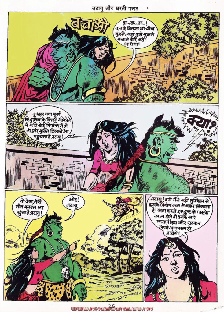 रंग संयोजन: इस कॉमिक्स में चटक और गहरे रंगों का खुलकर इस्तेमाल किया गया है। राक्षसों के लिए हरे और लाल रंग, जटायु के लिए सादा लेकिन वीर दिखने वाली पोशाक, और बैकग्राउंड में पीले व नीले रंग कहानी को जीवंत बनाते हैं।