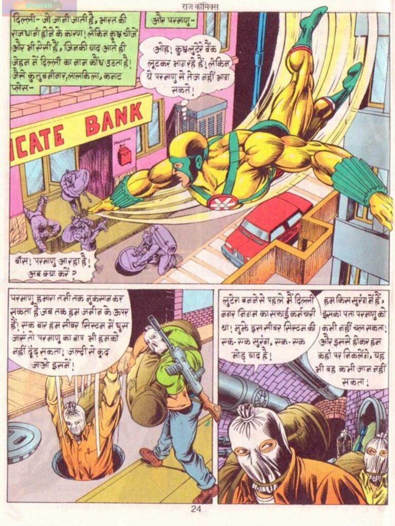 कहानी का दूसरा हिस्सा दिल्ली में परमाणु यानी विनय के पास पहुँचता है। यहाँ परमाणु का सामना बैंक लुटेरों से होता है, जो सीवर सिस्टम के जरिए भागने की कोशिश करते हैं। परमाणु का उन्हें पकड़ने का तरीका—सीवर में पानी की भारी बौछार करके उन्हें बाहर निकालना—दिखाता है कि वह अपने शहर के भूगोल और बुनियादी ढांचे का कितना समझदारी से इस्तेमाल कर सकता है।