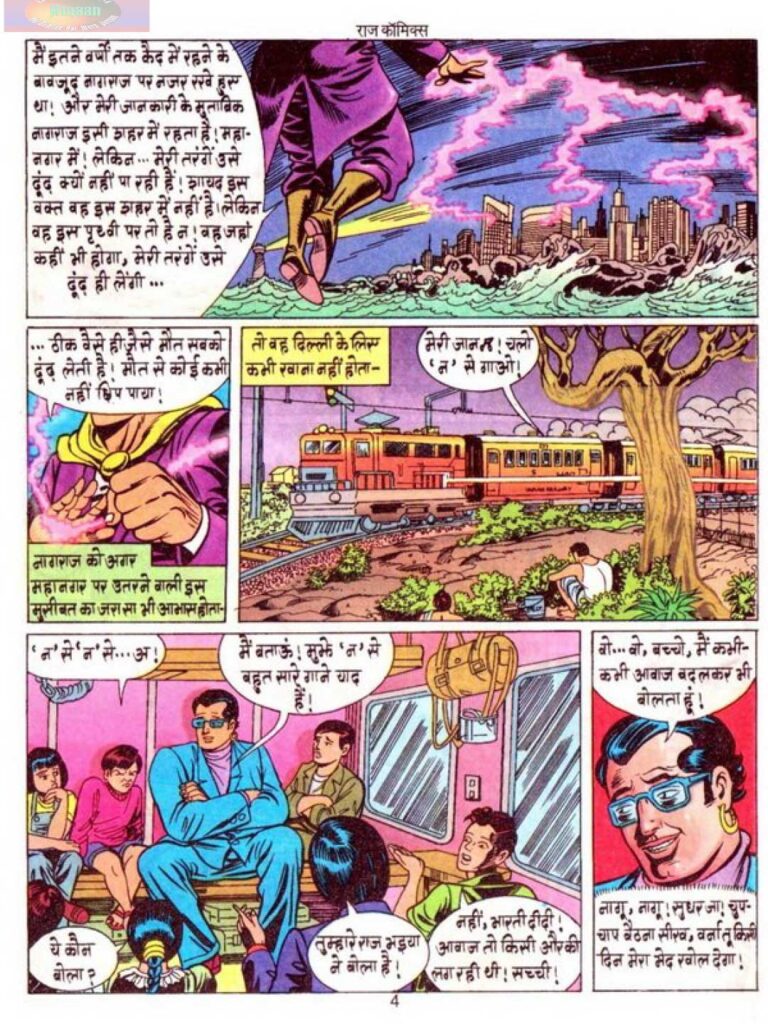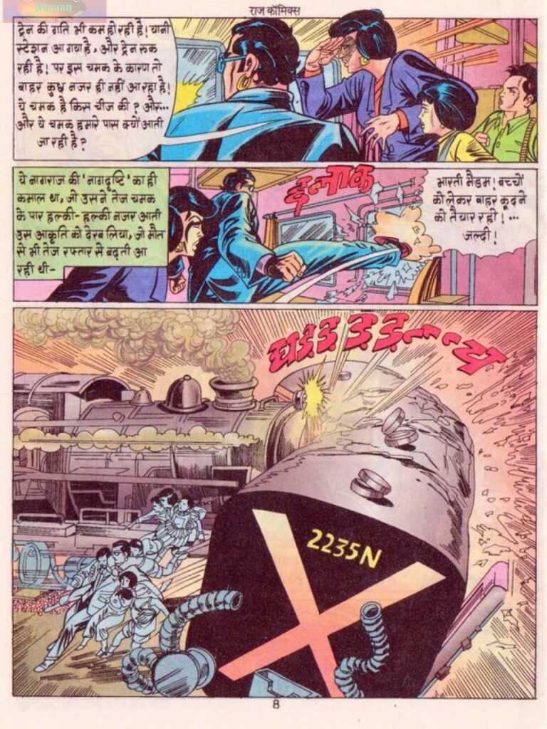 लोकोमोटो के साथ नागराज की लड़ाई इस कॉमिक्स के शुरुआती रोमांच में से एक है। लोकोमोटो कोई साधारण मशीन नहीं थी, वह जादू से चल रही थी और भाप (Steam) की अपार शक्ति का इस्तेमाल कर रही थी। नागराज यहाँ अपनी चतुराई दिखाता है। जब उसे पता चलता है कि सिर्फ ताकत काम नहीं कर रही, तो वह अपने ‘शीत-नाग’ (Ice snakes) की शक्तियों का उपयोग करता है। भाप को पानी में बदलना और फिर इंजन को एक ‘प्रेशर कुकर’ की तरह फटने पर मजबूर करना लेखक के वैज्ञानिक दृष्टिकोण को दर्शाता है। यह भाग हमें याद दिलाता है कि नागराज सिर्फ एक योद्धा नहीं, बल्कि एक चालाक रणनीतिकार भी है।