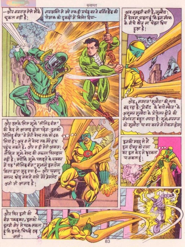 ‘कयामत ‘ (Kayamat) यह कॉमिक्स सिर्फ एक कहानी नहीं है, बल्कि ‘महानगर के रक्षक’ नागराज और ‘दिल्ली के रक्षक’ परमाणु के बीच उस मजबूत तालमेल का प्रमाण है, जो कहानी ‘सूरमा’ के बाद शुरू हुआ था। ‘कयामत ‘ एक बहु-प्रतीक्षित क्रॉसओवर (Crossover) था, जिसने पाठकों को जादू और विज्ञान के बीच होने वाले भयंकर युद्ध का गवाह बनाया। यह समीक्षा इस 90 पन्नों की महागाथा के हर पहलू—कथानक, पात्र चित्रण, कला और सामाजिक संदेश—का गहन विश्लेषण करेगी।