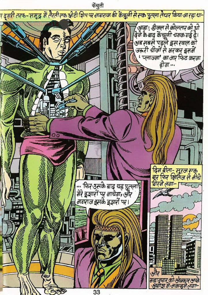 The name of that hybrid creature is Magraha, and it has been created by a crooked scientist named Julu. Julu’s ultimate goal is to make Nagraj his slave, and for this he has made a satanic plan. He wants to control the real Nagraj’s body through a replica earthworm (Knauul).
