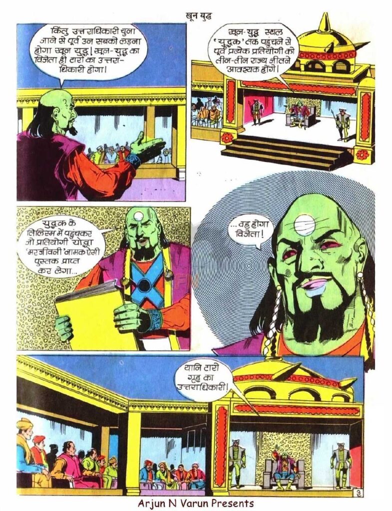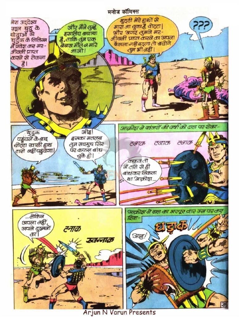 यह तकनीक और जादू का ऐसा मेल था जिसने कहानी को एक नया आयाम दिया। इसके जरिए सिर्फ योद्धाओं की वीरता ही नहीं दिखाई गई, बल्कि उन दर्शकों की प्रतिक्रियाएं भी शामिल की गईं जो इस युद्ध को देखकर डर, उत्साह या खुशी महसूस कर रहे थे। यह हिस्सा कहानी को एक ‘रियलिटी शो’ जैसा अनुभव देता है, जहाँ दर्शकों की भावनाएँ भी इस संघर्ष का हिस्सा बन जाती हैं। इससे साफ दिखता है कि मनोज कॉमिक्स के रचनाकार अपने समय से कितनी आगे की सोच रखते थे।