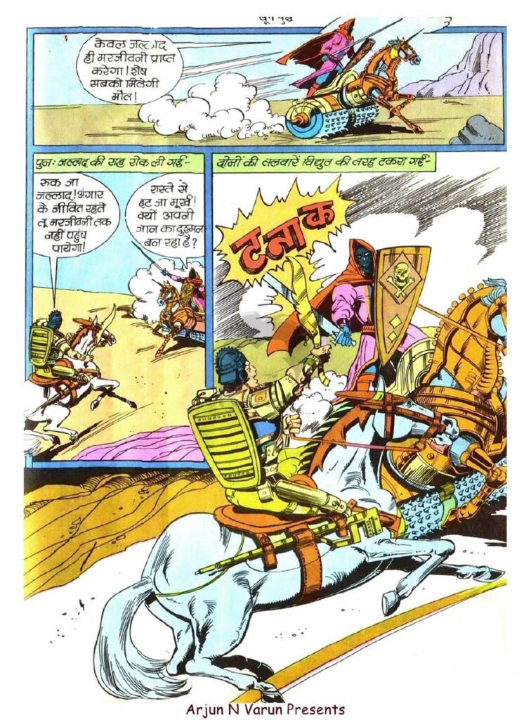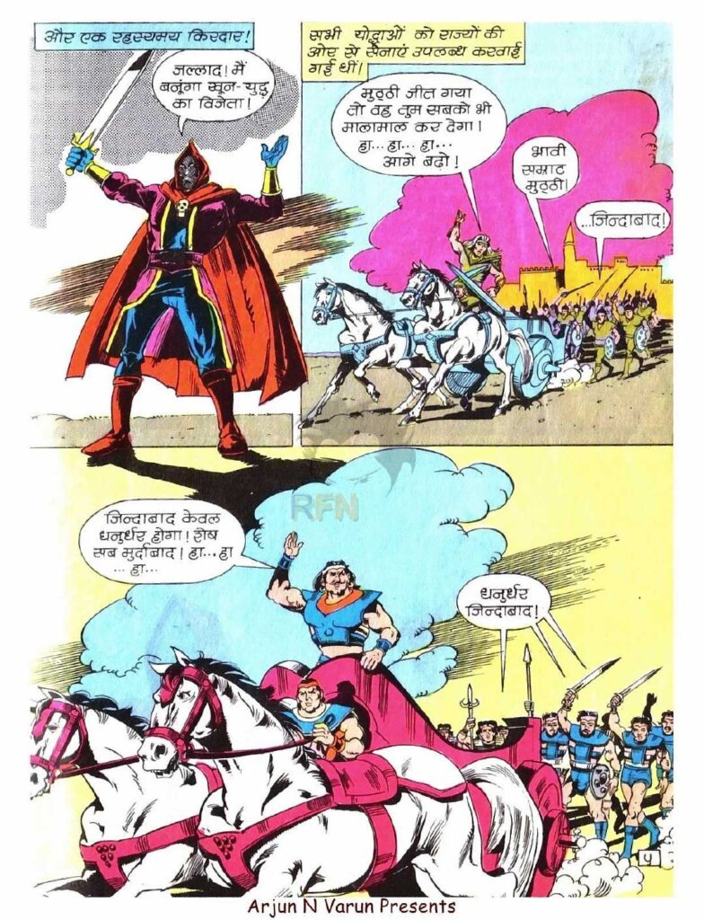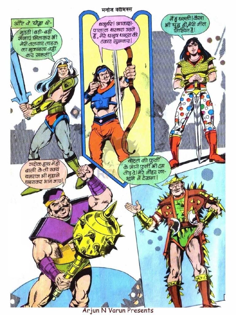 इस कॉमिक्स का सबसे रोमांचक हिस्सा वह है, जहाँ एक से बढ़कर एक योद्धाओं का परिचय दिया जाता है। लेखक ने यहाँ पात्रों को गढ़ने में शानदार कल्पनाशीलता दिखाई है। मुट्ठी जैसा योद्धा, जिसकी तलवार ‘ताड़क’ के एक ही वार से पूरी सेना गाजर-मूली की तरह कट जाती थी, पाठकों के मन में डर पैदा करने के लिए काफी था। वहीं धनुर्धर के धनुष की टंकार, जिसकी कल्पना भर से आकाश-पाताल कांप उठते थे, उसकी ताकत को साफ दिखाती थी।