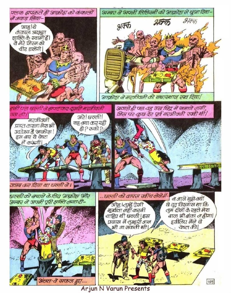 अंतिम युद्ध, जहाँ आक्रोश और अम्बर का सामना सीधे खतारो से होता है, वीरता का चरम उदाहरण बन जाता है। खतारो की जादुई आग और आक्रोश के दिव्य अस्त्रों के बीच का टकराव पन्नों पर बिजली की तरह चमकता है। जब आक्रोश अपनी पूरी ताकत से खतारो की साजिश को खत्म करता है और अम्बर को सम्मोहन से मुक्त कर देता है, तो पाठक को गहरी संतुष्टि मिलती है। अंत में सत्य की जीत और अन्याय का अंत एक ऐसा सुखद अहसास देता है, जो पुरानी कॉमिक्स की सबसे बड़ी खासियत रहा है।