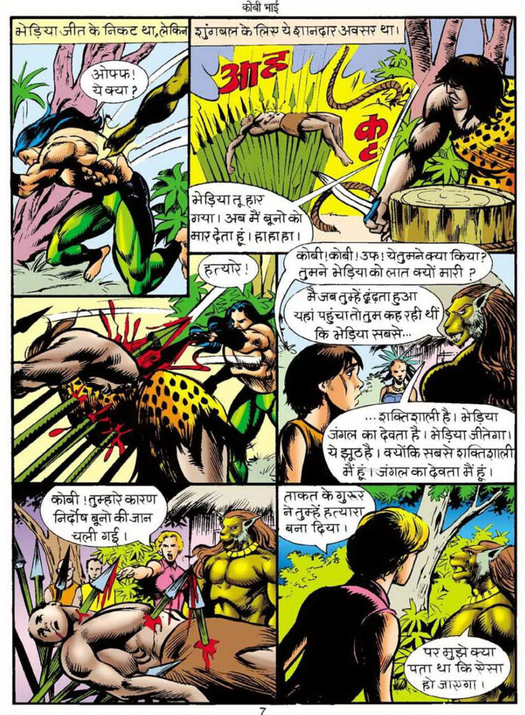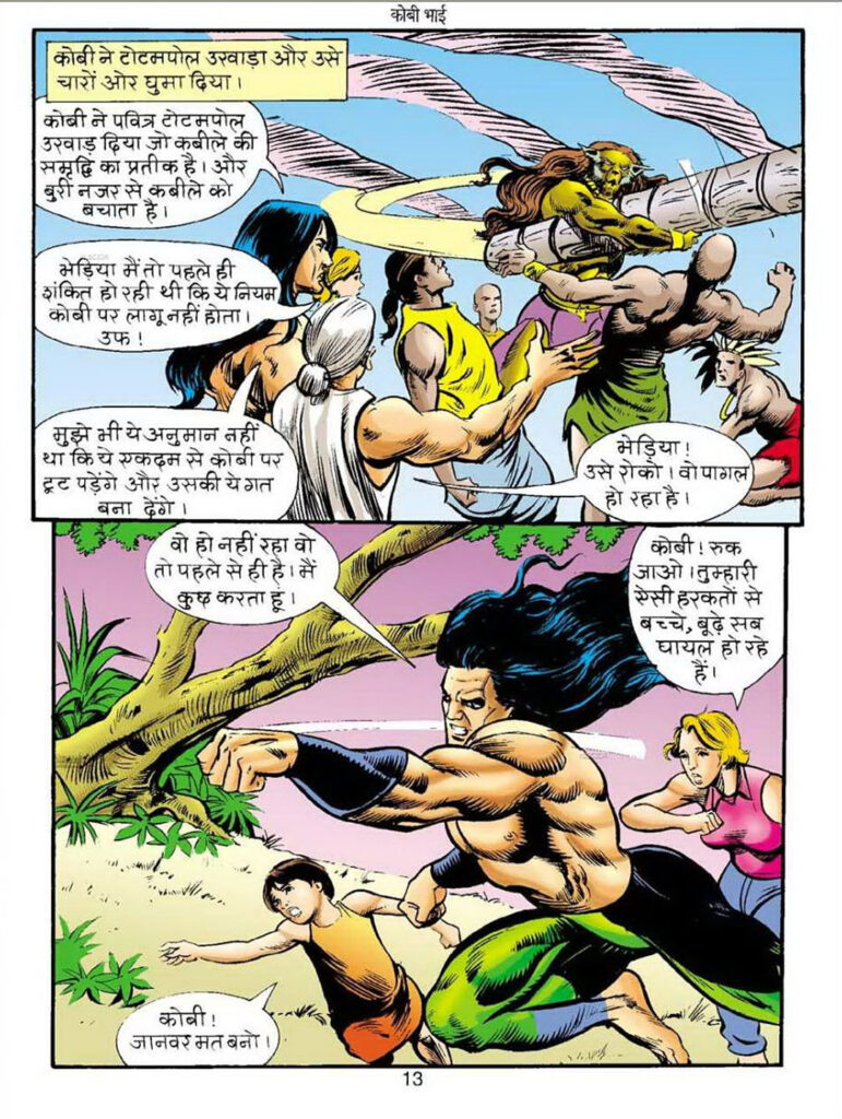 Suresh Deegwal’s penciling and Adil Khan’s inking are reminiscent of the golden age of Raj Comics. The painting is extremely dynamic and full of energy. The characters’ physiques, especially the giant and muscular bodies of Kobi and Bhediya, effectively reflect their power. The depiction of the action scenes is excellent; movement and impact are felt in every panel of the fight. The characters’ facial expressions, be it Kobi’s arrogance and subsequent pain, Bhediya’s resolve, or Jane’s anger and despair, are carved in a very vivid way. The color combination done by Sunil Pandey helps in establishing the mood of the story. The jungle scenes use green and brown colors, while the Mumbai scenes use modern and dark colors which reflect the complexity of urban life.