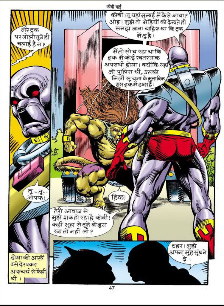The old brother uses Kobi as his most dangerous weapon. On the other hand, two more crime-fighting heroes are active in Mumbai—Bhediya (who is in the city with Jane for some reason) and Mumbai’s own protector, Doga. The story now lays the foundation for a triangular conflict, with the heroes Doga and Bhediya on one side, the Old Brother’s criminal empire on the other, and Kobi Bhai standing between the two—a character who is both the hero and the villain, blurring the boundaries.