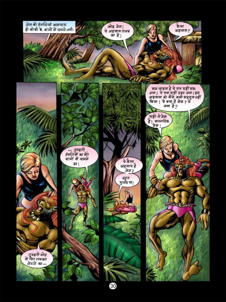 As the story progresses, the character of Kobi begins to change from within. Jane explains to him that she is a human being and that her needs are different from Kobi’s. Kobi’s insistence that Jane stay with him slowly begins to turn into a sense of responsibility. Kobi brings cooked food (fish and fruit) for Jane and tries to build a hut for her to live in. Here, Kobi’s ‘animal form’ gradually starts becoming more like a ‘human form’. He does all this not because he needs it, but because he wants to see in Jane’s eyes the same respect and love for himself that she feels for Bhediya. This is a very emotional situation, where a being is trying to change its true nature so that it can become worthy of its beloved. But can an animal become a complete human being? Or can a human ever be happy with an animal? These questions continue to run through the reader’s mind throughout the comic.