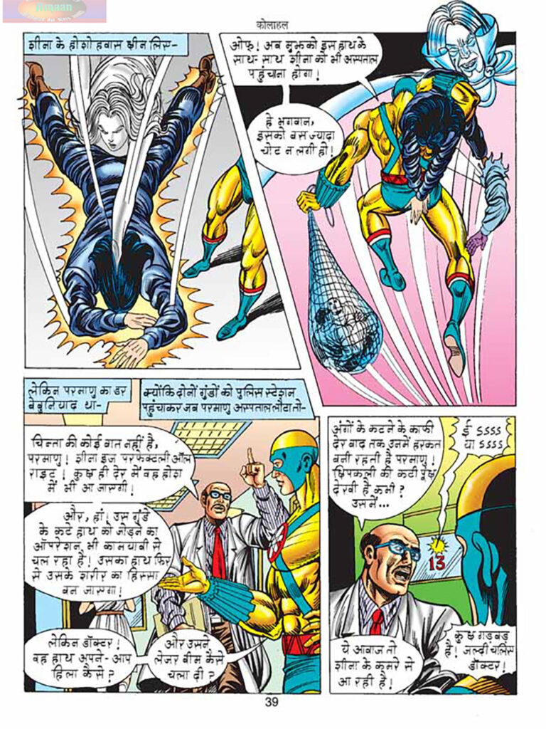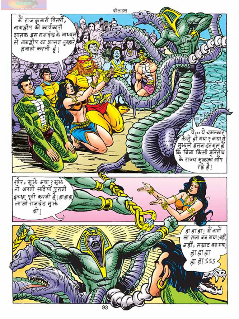 The magic of a team-up always thrills readers, and ‘Kolahal’ makes excellent use of this formula. Here, every hero gets a chance to shine. An interesting combination of science and magic can be seen in the story. Dhruv and Parmanu take the side of science, while Nagraj, Shakti, and Lori represent magic and spirituality. The balance between these two currents makes the story stronger.