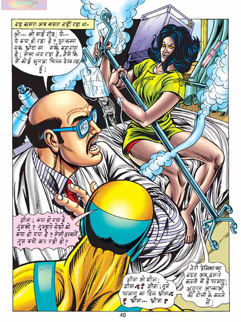 In this comic, the role of Parmanu emerges as the most emotional. He is the one who suffers the most pain and stress due to Dracula’s possession of Sheena’s body. His anger, his helplessness, and his fear give a human touch to the story. When he warns Dracula—“If Sheena is even scratched, I will burn the world”—it becomes not just a threat, but the scream of his heart.