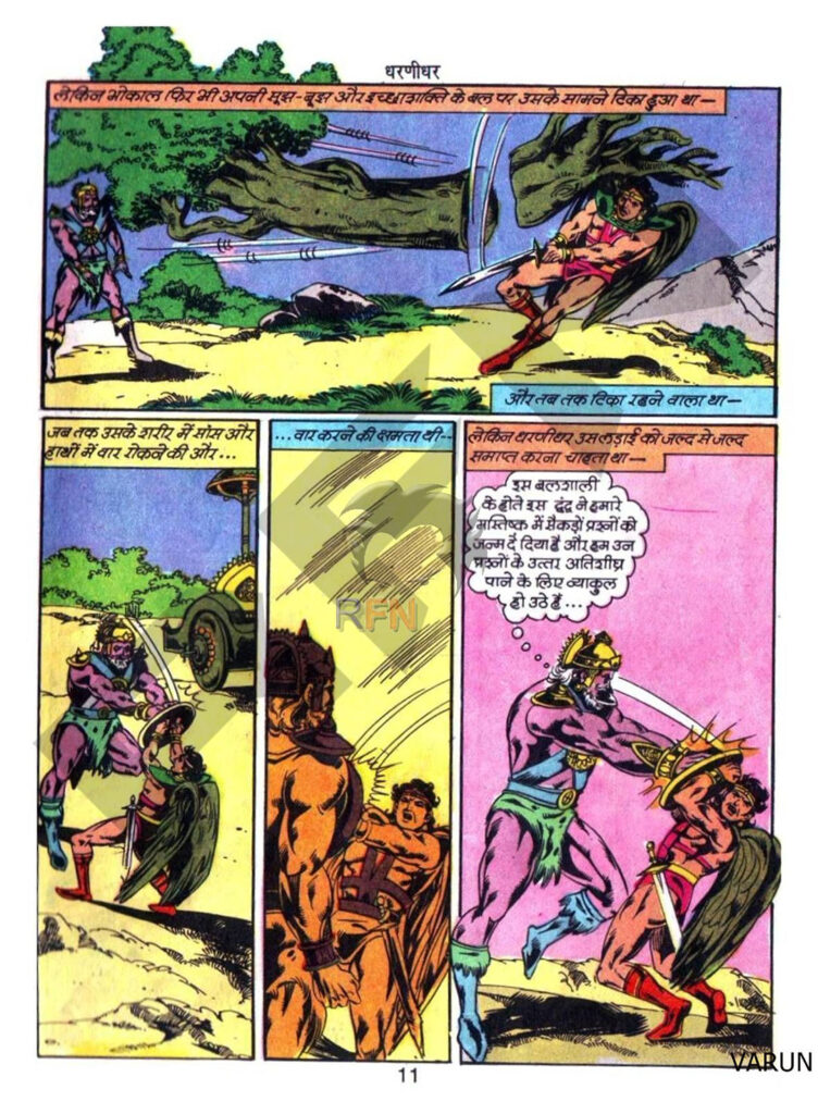 उसकी प्रलयंकारी तलवार, जो लोहे को मक्खन की तरह काटती है, धरणीधर की त्वचा को खरोंच तक नहीं पहुंचा पाती।