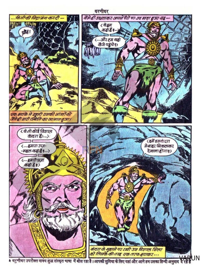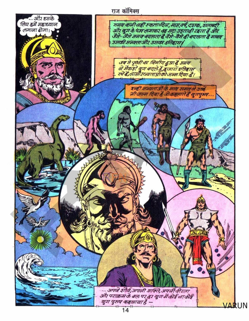 कहानी के बीच में एक गहरा दार्शनिक पहलू दिखाया गया है। बताया गया है कि कैसे समय के साथ सभ्यताएँ बदलती गईं—सतयुग, त्रेतायुग, द्वापरयुग और अब कलयुग। राम, कृष्ण, पांडव जैसे महान युग-पुरुष आए और चले गए। धरणीधर इस बदलाव से अनजान था। जब वह जागता है और धरती को छोटे-छोटे देशों में बँटा हुआ देखता है, तो उसे बड़ा झटका लगता है। यह हिस्सा कॉमिक्स को सिर्फ मारधाड़ नहीं, बल्कि सोचने लायक बनाता है।