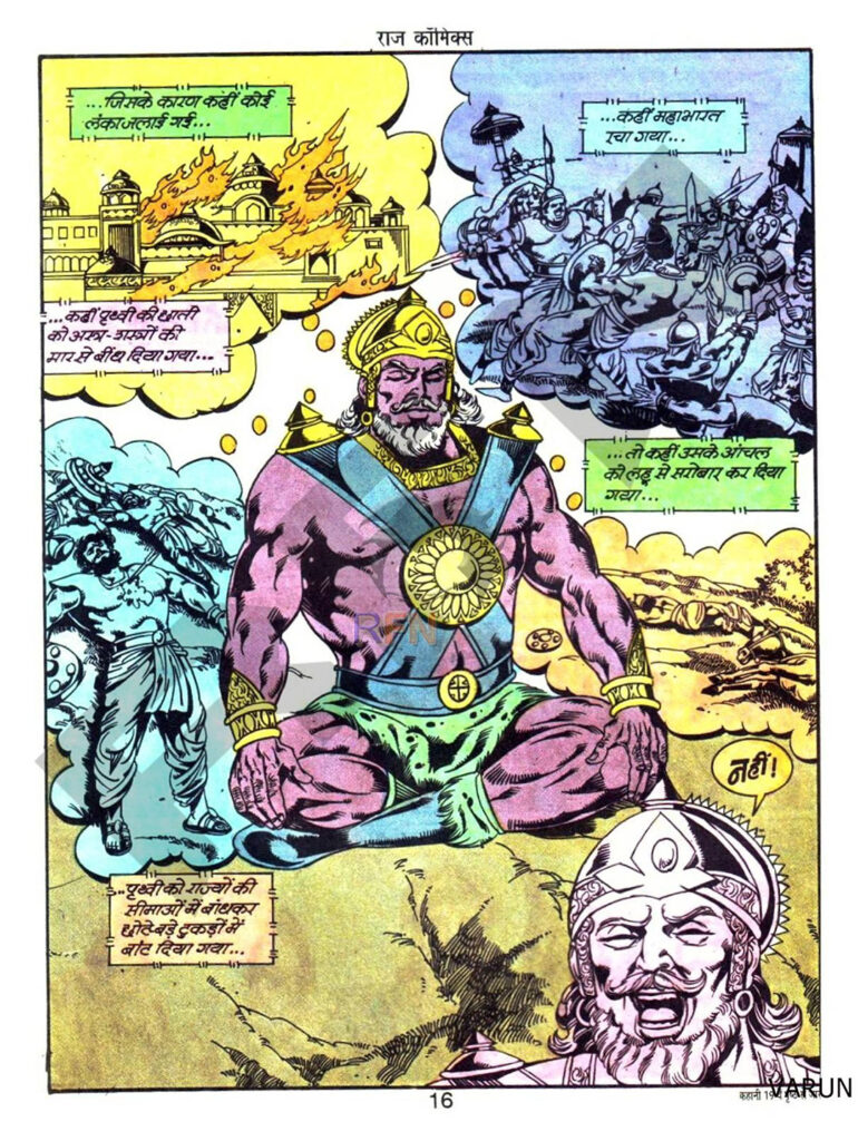 परशुराम और धरणीधर वाले पन्नों में रंगों का इस्तेमाल बहुत खूबसूरत है। पौराणिक समय दिखाने के लिए कपड़ों और बैकग्राउंड का चयन बेहतरीन है। धरणीधर के चेहरे पर घमंड, गुस्सा और बाद में कलियुग की हालत देखकर हुए दुःख—सब कुछ कलाकारों ने बहुत अच्छी तरह दिखाया है।