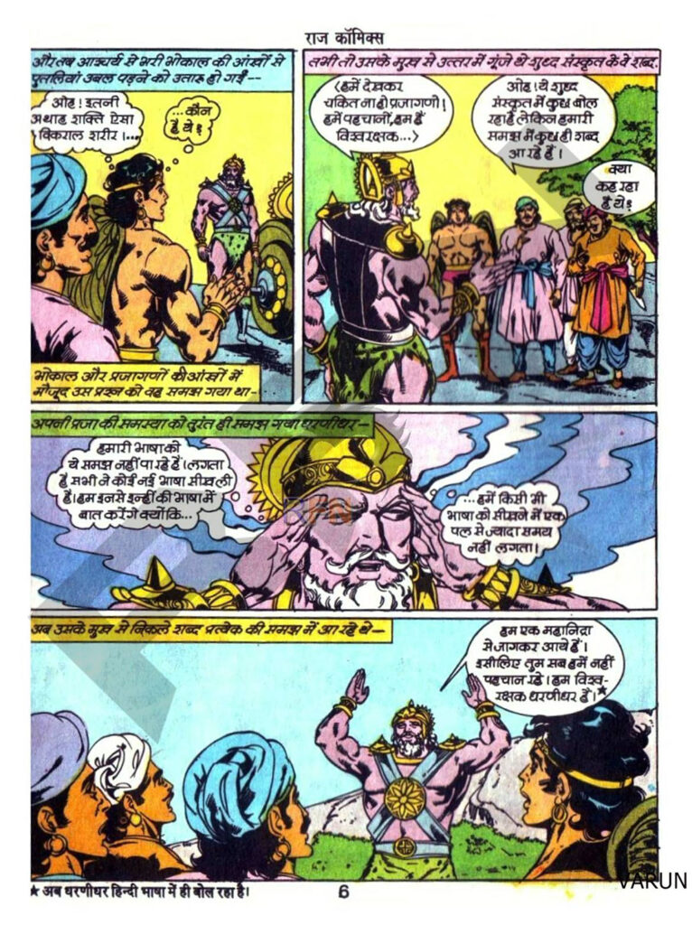 भूकंप के कारण भोकाल का रथ एक गड्ढे में फंस जाता है। सैनिक और स्वयं भोकाल उसे बाहर निकालने की कोशिश करते हैं, तभी धरणीधर वहाँ पहुँचता है और एक हाथ से उस विशाल रथ को उठा लेता है। यहाँ एक दिलचस्प हिस्सा है—धरणीधर अपनी ‘मानसिक शक्ति’ से सामने वाले का दिमाग पढ़कर उनकी भाषा (हिंदी) सीख लेता है।
