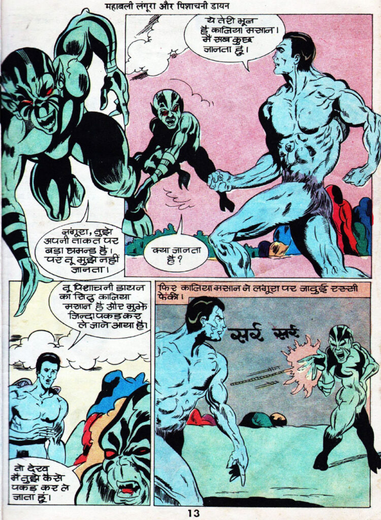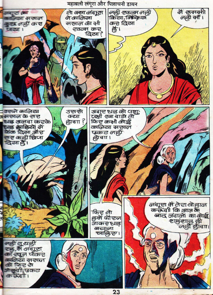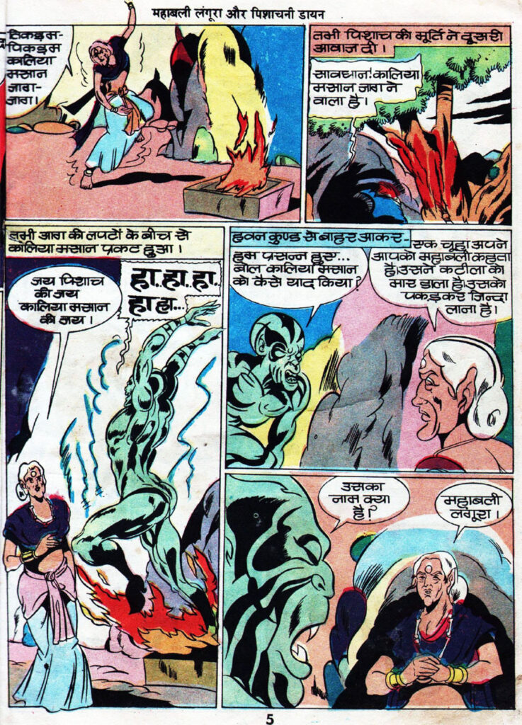 यहीं से कहानी में पल्प-हॉरर का मज़ेदार ट्विस्ट आता है। सिर कटने के बाद भी कालिया मसान मरता नहीं है, बल्कि उसका सिर फिर से अपने धड़ से जुड़ जाता है। वह ज़ोर-ज़ोर से हंसते हुए कहता है कि उसे कोई मार नहीं सकता। इस मौके पर लंगूरा सिर्फ ताकत नहीं, बल्कि अपनी समझदारी दिखाता है। वह समझ जाता है कि यह एक ‘सिद्ध पिशाच’ है जिसे साधारण तरीके से नहीं मारा जा सकता।