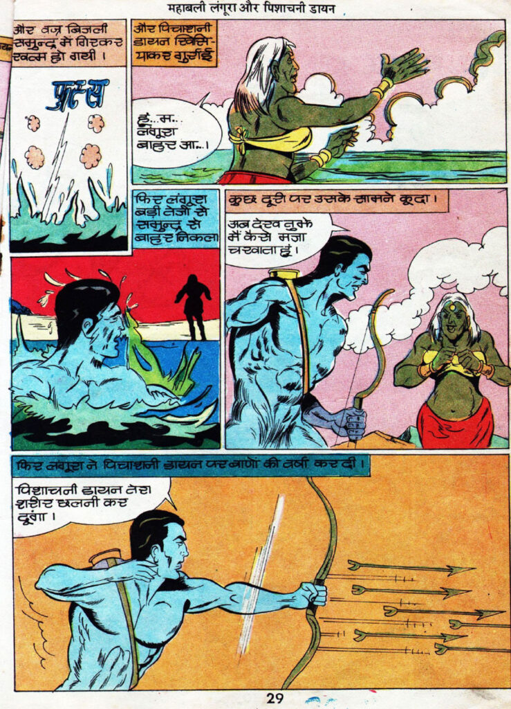 अंतिम लड़ाई के पल बेहद रोमांच से भरे हुए हैं। डायन अपने अग्नि चक्र और कंकाल सेना छोड़ती है, जिन्हें लंगूरा अपने अग्नि बाणों से भस्म कर देता है। इसके बाद वह आकाश से वज्र बिजली (Lightning Bolt) चलाती है। लंगूरा चालाकी से उस बिजली को अपने पीछे लगाता है और समुद्र में छलांग लगा देता है, जिससे बिजली पानी में गिरकर बेअसर हो जाती है।