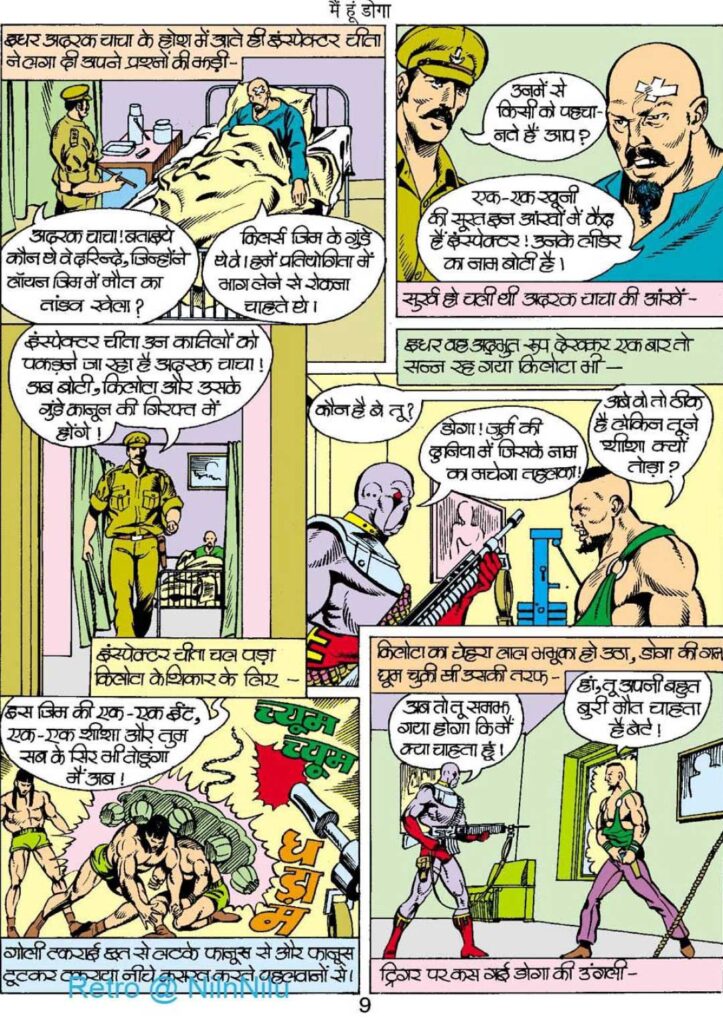 कहानी का क्लाइमेक्स तब शुरू होता है जब डोगा ‘किलर्स जिम’ में घुसकर तबाही मचा देता है। यहाँ मनु का आर्टवर्क अपने चरम पर नजर आता है। गोलियों की आवाज, टूटते कांच और उड़ते हुए पहलवान—हर पैनल में जबरदस्त एक्शन दिखाई देता है।