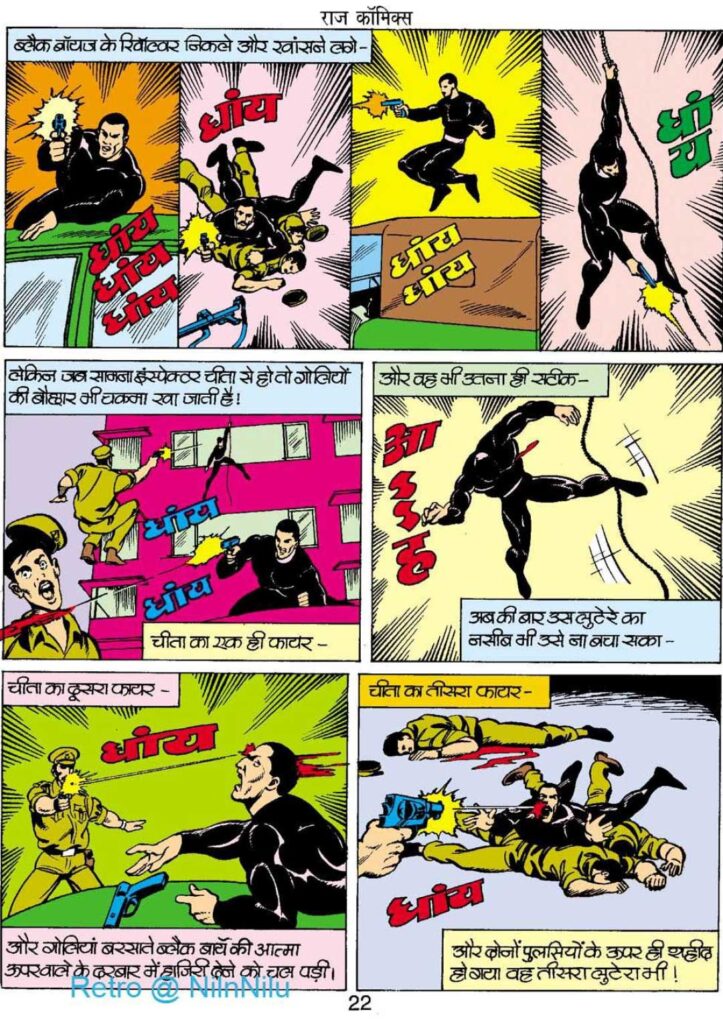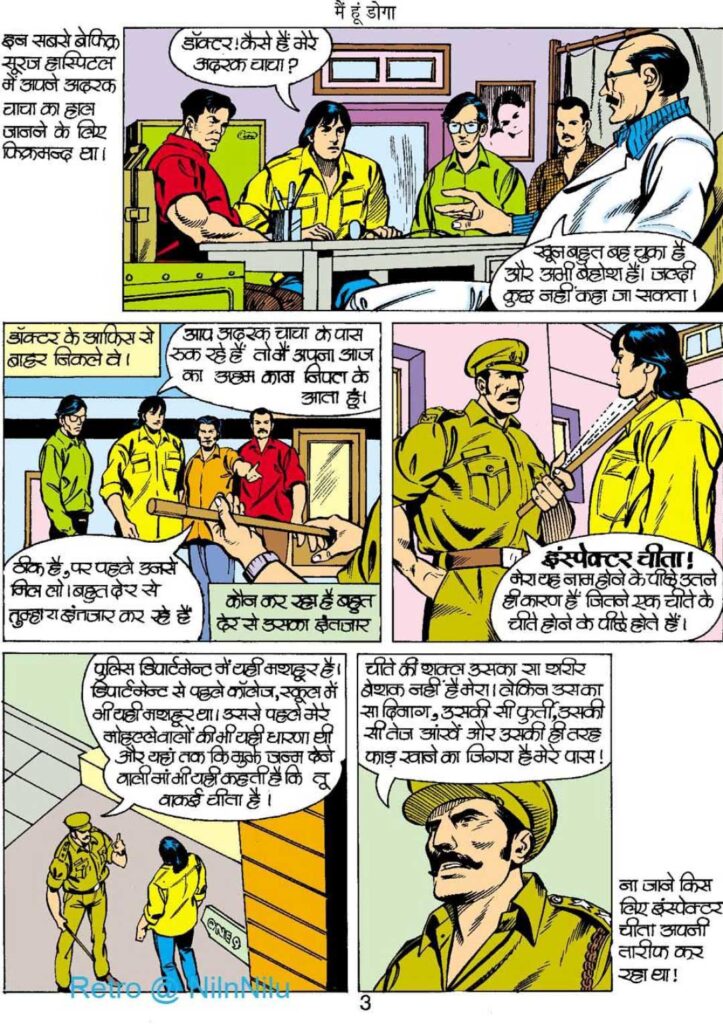 इस्पेक्टर चीता का संवाद— “मेरा यह नाम होने के पीछे उतने ही कारण हैं जितने एक चीते के चीता होने के पीछे होते हैं”—उसके आत्मविश्वास और तेज-तर्रार स्वभाव को दिखाता है। वह डोगा का लगातार पीछा करता है, लेकिन धीरे-धीरे उसे भी महसूस होने लगता है कि डोगा वही कर रहा है जो पुलिस लंबे समय से नहीं कर पा रही थी। यही सोच कहानी में गहराई जोड़ती है।