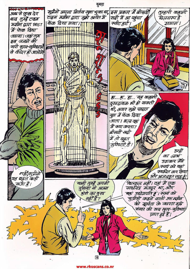 चित्रण (Artwork): नरेश कुमार और मुकेश का आर्टवर्क 90 के दशक की कॉमिक्स शैली का शानदार उदाहरण है। कुबड़े के हाव-भाव, भविष्य के रोबोट्स और एलियन जहाज—सबका चित्रांकन कहानी के मूड के अनुरूप है। रंगों का इस्तेमाल (खासकर कुबड़ा वाली कहानी में सोने की चमक और अंधेरे का फर्क) भी काफी प्रभावशाली है।