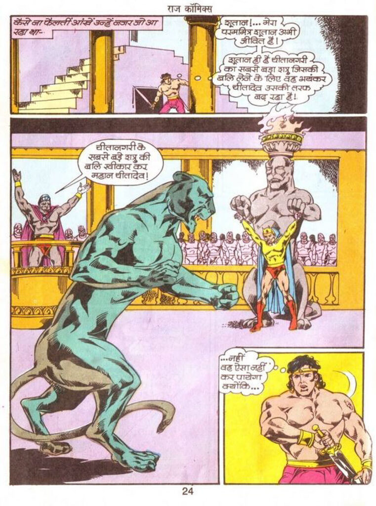 The climax of the story comes in the temple of Cheetah-deva. Here, Bhokal is surprised to see that Shutan is still alive, but he has been tied up for sacrifice. The Cheetah-deva, a giant stone statue-like figure, wakes up and grows to attack Shutan. The war between Bhokal and this demon is very grand and memorable. When common attacks prove useless, Bhokal drops the burning fire-pit on the demon, causing the entire temple to catch fire.