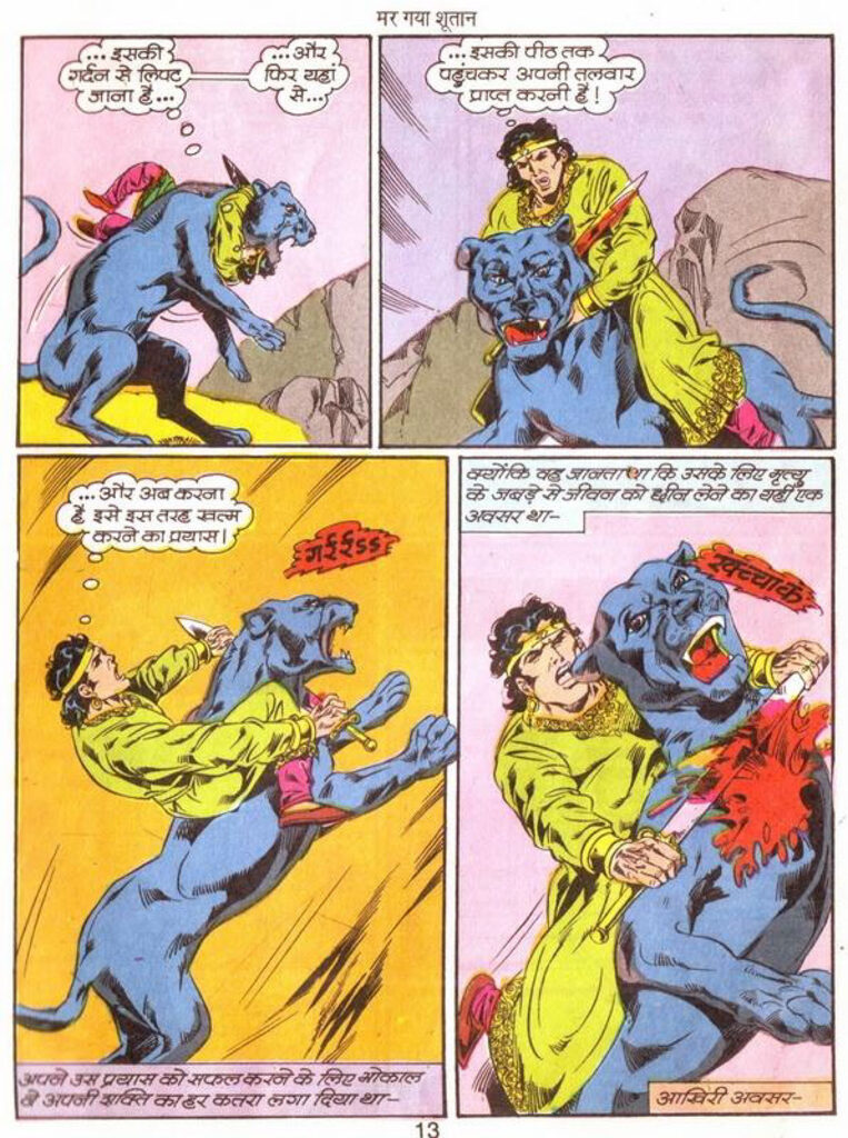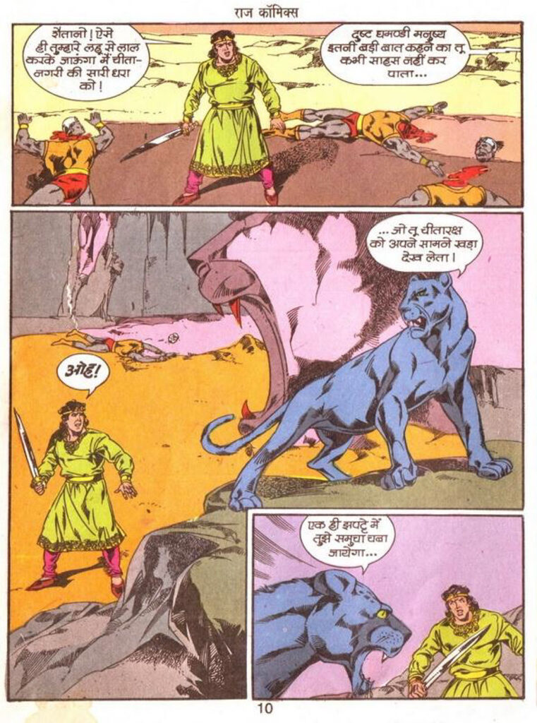 What happens in the last pages makes any reader’s eyes moist. Shutan, who is counting his last breaths due to terrible torture, uses his remaining hypnotic power not to save himself, but to save Bhokal from the cheetah-humans who surround him. He dies in Bhokal’s lap. In the final scene, Bhokal sees a divine vision, where his sister Toorin (who was already dead) is seen taking Shutan with her. Bhokal’s screaming and calling out to his sister and friend gives a very emotional ending to the story.
