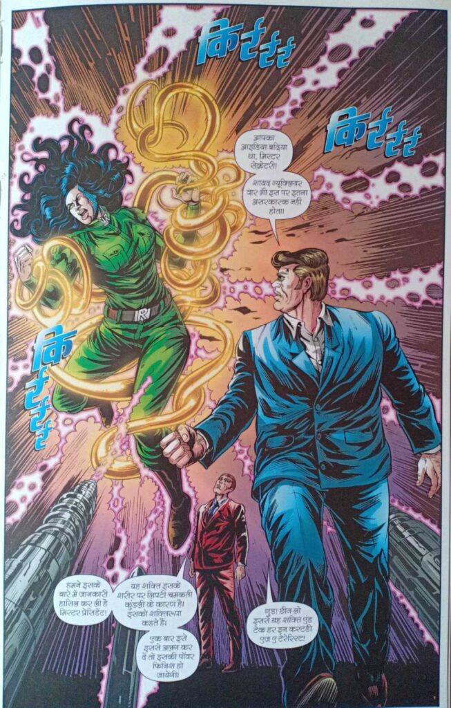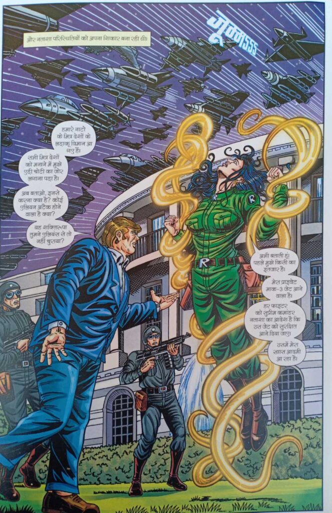 In this part, the scope of the story extends from Rajnagar and Stree-Bhoo to the whole world. Natasha gains the power to fly with the help of Shaktirupa and directly attacks America’s White House. Anupam Sinha here shows the US President (who has been given a look like Donald Trump) and his security arrangements as very weak in front of Natasha.