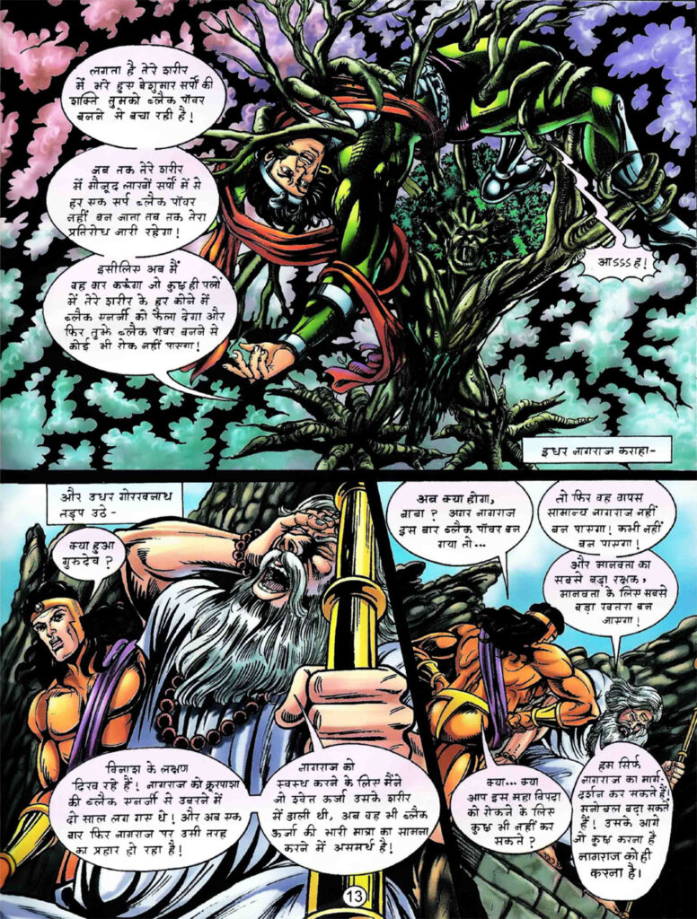 यह इस कॉमिक्स का सबसे अहम और सबसे अंधकारमय अध्याय है। डार्क वुड के घने जंगलों में नागराज अब पूरी तरह से ‘ब्लैक पावर्स’ के कब्जे में आ चुका है। उसका शरीर काले रंग में बदल चुका है और उसकी आँखों में अब करुणा नहीं, बल्कि क्रूरता झलकती है। वह अब मानवता का रक्षक नहीं रहा, बल्कि क्रूरपाशा का सबसे ताकतवर योद्धा बन गया है। दूर से बाबा गोरखनाथ और धनंजय इस विनाश को देखते हैं, लेकिन वे भी खुद को असहाय महसूस करते हैं। नागराज का अपने ही गुरु ‘द्रोण’ (बायो-रोबोट) से आमना-सामना होना एक ऐतिहासिक और भावनात्मक दृश्य बन जाता है। द्रोण उसे ‘मृत्यु-ऊर्जा’ से रोकने की कोशिश करते हैं, लेकिन ब्लैक नागराज की शक्तियाँ अब दिव्य अस्त्रों से भी आगे निकल चुकी हैं।
