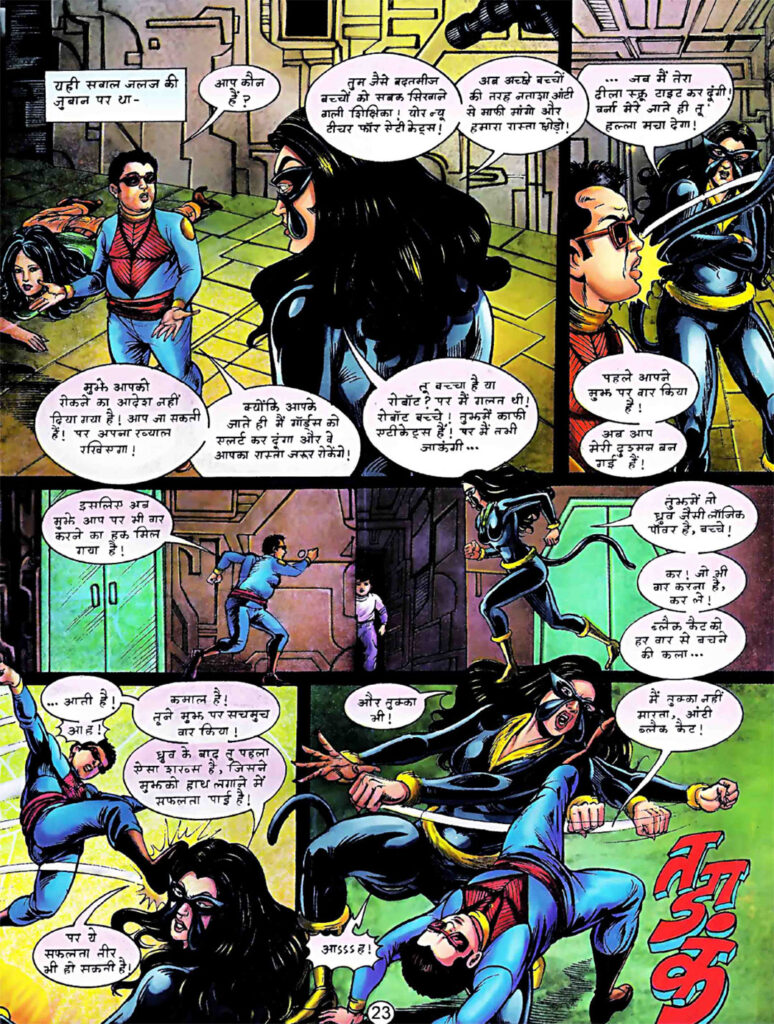उधर महानगर यानी Underground City के भीतर, सुपर कमांडो ध्रुव की निजी ज़िंदगी पूरी तरह बिखर चुकी है। नताशा और ग्रैंड मास्टर रोबो शहर की हवा और पानी की सप्लाई रोक देते हैं, ताकि वे अपने शासन की नींव मजबूत कर सकें। ध्रुव का बेटा ऋषि अपनी ही माँ नताशा के पास कैद है। इसी बीच ‘ब्लैक कैट’ यानी रिचा की एंट्री होती है, जो नताशा के चंगुल से ऋषि को बचाने की कोशिश करती है। यह अध्याय दिखाता है कि चाहे सुपरहीरो कितना भी शक्तिशाली क्यों न हो, वह अपने परिवार, रिश्तों और वफादारी के बीच किस तरह टूटता और जूझता है।