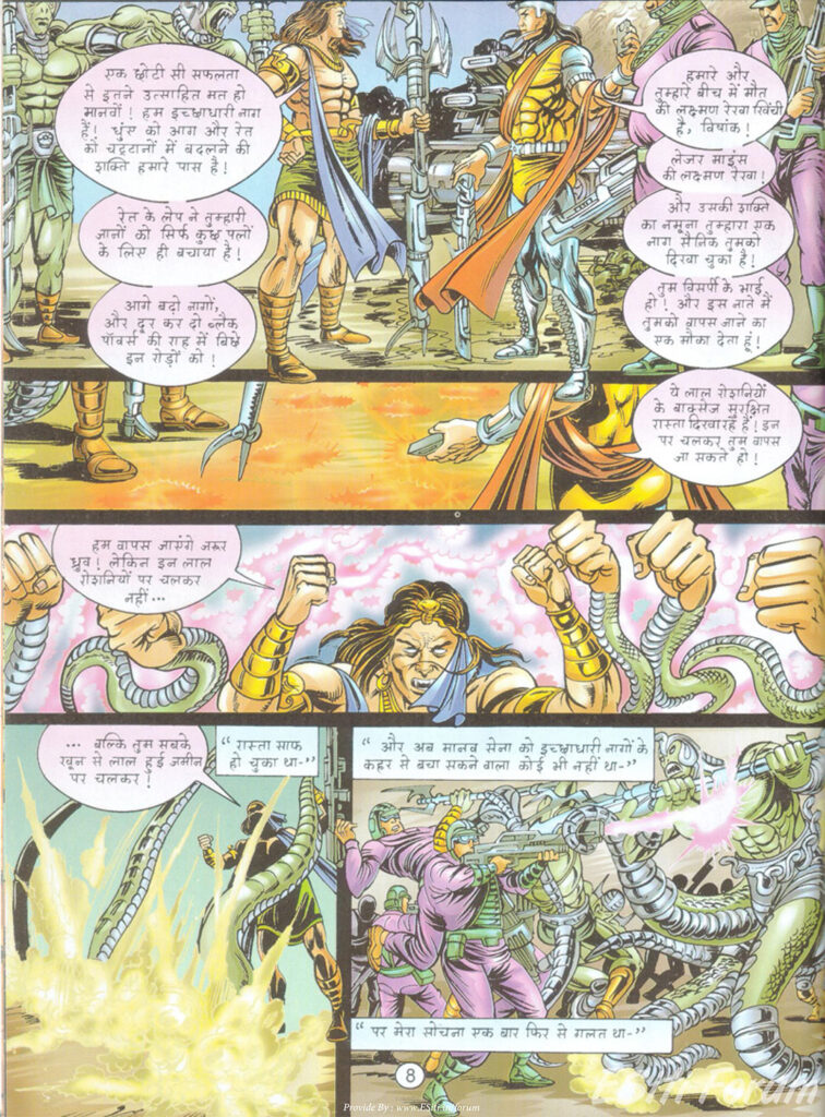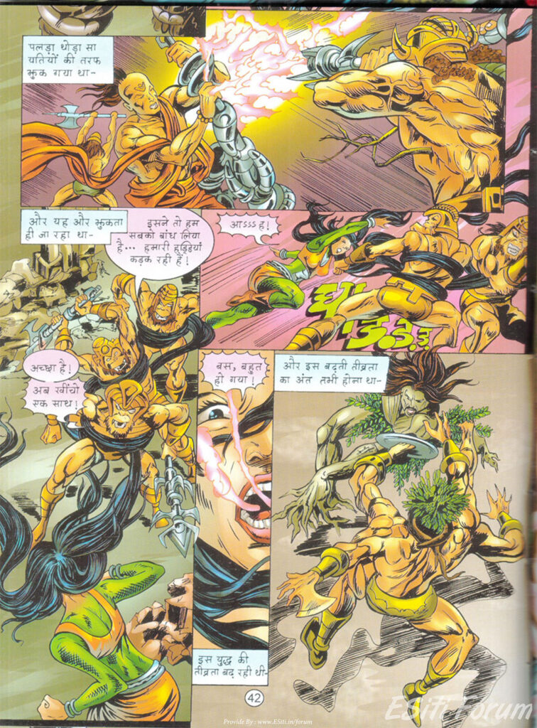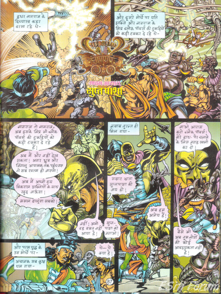 अपनी हार से बौखलाया क्रूरपाशा ‘ब्लैक पावर्स’ की पूरी सेना को मैदान में उतार देता है। यहाँ नागराज और ध्रुव की सेना—जिसमें यति और नाग योद्धा शामिल हैं—के बीच जबरदस्त टक्कर होती है। अनुपम सिन्हा ने जिस तरह से इस युद्ध को चित्रों में उतारा है, वह सीधे ‘महाभारत’ के कुरुक्षेत्र की याद दिला देता है।