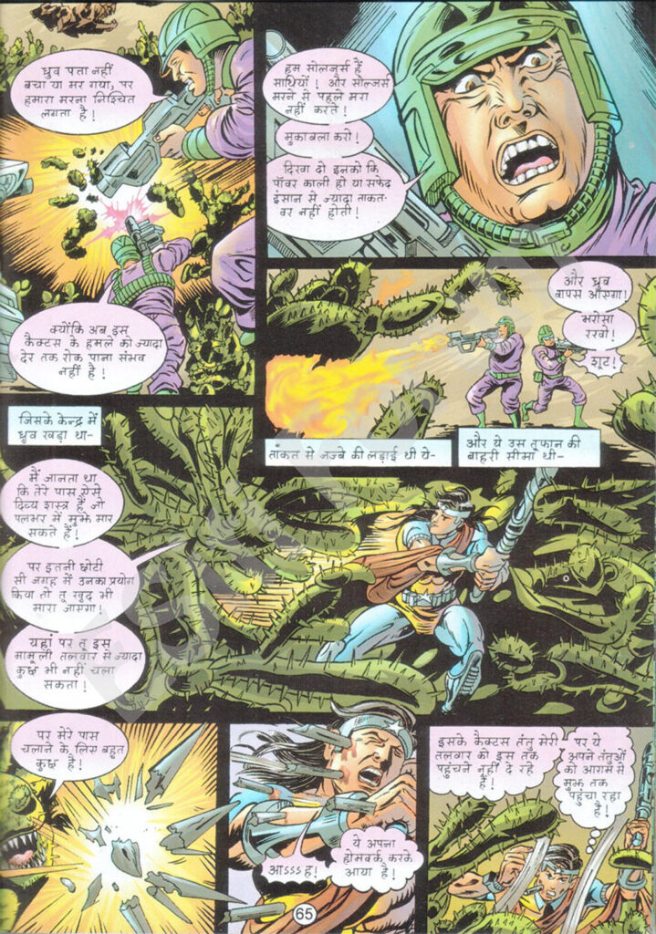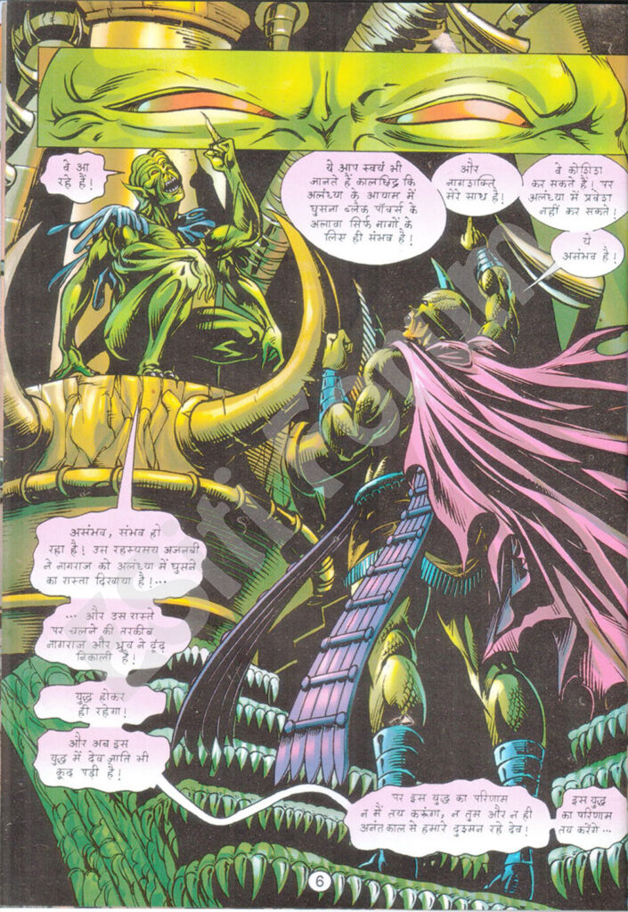 The story begins with Alandhya entering a dangerous dimension. Just as Rama built a bridge over the sea to reach Lanka, similarly here Nagraj and Dhruv need a different kind of bridge, made of science and magic, to cross the strong protective walls of Alandhya. Dhruv shows his amazing understanding and uses dry ice, i.e., solid carbon dioxide, and eliminates the clouds that were giving strength to the black powers. This scene clearly shows that Dhruv’s real strength is not his muscles, but his brain.