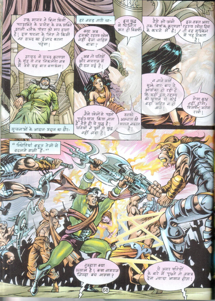The living proof of why Anupam Sinha is called the uncrowned king of Indian comics is ‘Summer Scandal’. The tall buildings of Alandhya, the flying crafts, and the grand battles of thousands of Yeti and Naga warriors are shown so closely that each panel can be watched for hours. In emotional close-ups—when Dhruv recognizes his sister or when Nagraj screams at Bharti’s sacrifice—the lines on their faces and the moisture in their eyes reach straight to the reader’s heart. The use of dark colors, deep shadows, and smoky shapes to portray black powers fills the atmosphere with fear and mystery. Through dynamic paneling, the action and fast movement of characters bursting out of frames in fight scenes become truly worth watching.