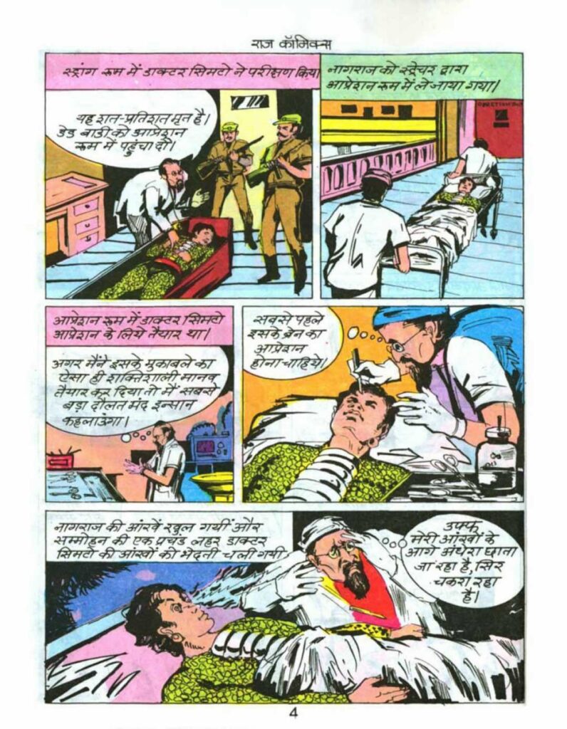 बुलडॉग के आदमी मलबे से नागराज का “शव” निकालकर लाते हैं। बुलडॉग चाहता है कि डॉक्टर सिमटो नागराज के शरीर की जांच करें ताकि वे नागराज जैसा ही एक ताकतवर कृत्रिम मानव (Android/Machine) बना सकें। लेकिन यहीं कहानी में बड़ा मोड़ आता है। नागराज मरा नहीं था, बल्कि उसने अपनी सांसें रोक ली थीं। ऑपरेशन टेबल पर वह अपनी ‘सम्मोहन शक्ति’ (Hypnotism) का इस्तेमाल डॉक्टर सिमटो पर करता है और उसे अपने काबू में कर लेता है।