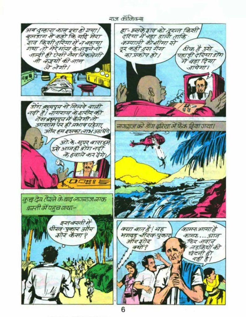 नदी से बाहर निकलने के बाद नागराज एक बस्ती में पहुँचता है जहाँ ‘कामरू’ नाम का एक क्रूर दरिंदा लड़कियों को उठा ले जाता है। नागराज यहाँ एक रक्षक के रूप में सामने आता है। वह न केवल कामरू और उसके गुंडों की जमकर पिटाई करता है, बल्कि गांव वालों के दिल से डर भी निकाल देता है।
