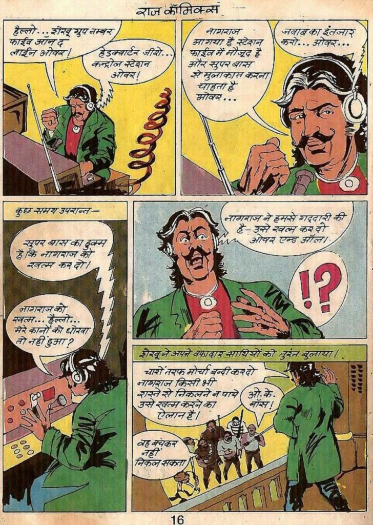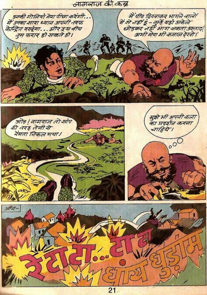 However, Nagraj defeats Romo with the help of his martial arts (Snake Hand Style) and amazing powers. Romo becomes Nagraj’s friend and companion, impressed by his strength and his righteous thinking. The story then takes many twists and turns. Nagraj and Romo together destroy Shoru’s hideouts. Finally, Bulldog nervously contacts Professor Nagmani, where he learns that Nagraj is now out of their control. Bulldog decides to bomb his headquarters so that Nagraj will die buried under the debris. The comic ends on a tremendous ‘cliffhanger’, where Nagraj and Romo are buried under the rubble.