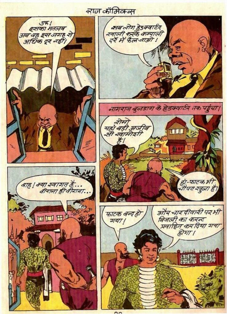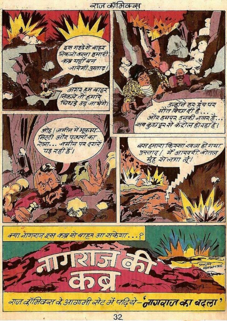 The title of the comic Grave of Nagraj arouses curiosity in the minds of readers. Throughout the story, readers remain curious to know whether Nagraj will really die. In the last few pages, Bulldog’s fear and his suicidal decision (blowing up the headquarters) bring the story to a climax. The picture of Nagraj and Romo buried under the debris and the question written below—”Will Nagraj be able to come out of this grave?”—forces readers to buy the next comic, “Rebel of Nagraj”. It was a great way to tell a story and market it.