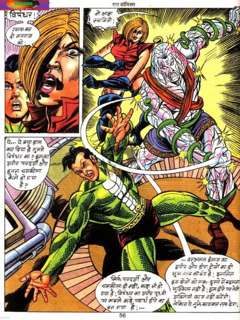 नागराज की दुश्मन नागिना का वफादार साथी विषंधर इस कहानी में एक बिल्कुल नए और खतरनाक रूप में सामने आता है। इस बार डॉ. पोल्का ने उस पर ऐसा प्रयोग किया है कि उसका शरीर हीरे की तरह सख्त बन जाता है। हीरा पृथ्वी के सबसे कठोर पदार्थों में से एक माना जाता है, इसलिए नागराज के दाँत और उसका ज़हर भी उस पर कोई खास असर नहीं कर पाते। इतना ही नहीं, विषधर का यह चमकदार और कठोर शरीर नागराज के हमलों को वापस उसी पर लौटा देता है। यानी नागराज जितनी ताकत से वार करता है, उतना ही खतरा खुद उसके लिए बन जाता है। यही बात इस लड़ाई को और भी मुश्किल बना देती है। यहाँ कहानी का असली तनाव यही है कि नागराज को ऐसे दुश्मन से लड़ना पड़ रहा है जिसे वह न तो आसानी से तोड़ सकता है, न पिघला सकता है और न ही जला सकता है। यह स्थिति कहानी को बेहद रोमांचक बना देती है और पाठक हर पन्ने पर यह सोचता रहता है कि आखिर नागराज इस मुसीबत से बाहर कैसे निकलेगा।