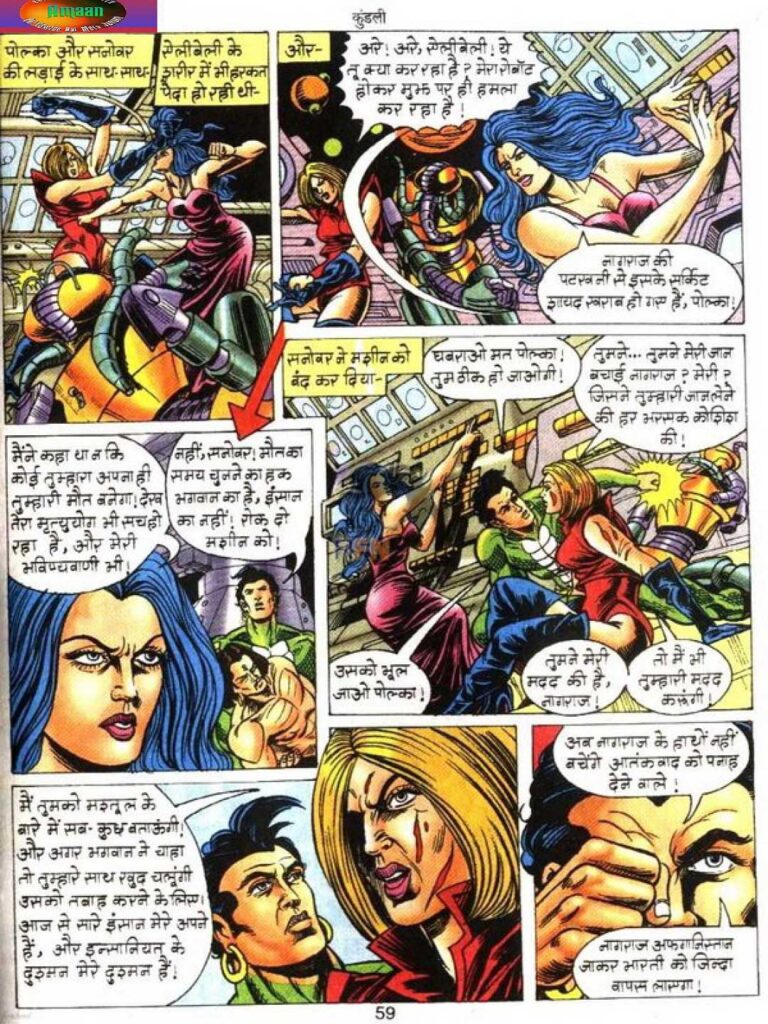 डॉ. पोल्का का बनाया हुआ ‘एली-बेली’ कोई साधारण रोबोट नहीं है। यह एक ऐसा मशीन योद्धा है जिसमें नागिना ने अपनी अतिरिक्त तांत्रिक शक्ति भर दी है। यानी यह सिर्फ मशीन नहीं, बल्कि तंत्र और तकनीक का मिला-जुला खतरनाक रूप है। कॉमिक्स के बीच में जब नागराज और एली-बेली आमने-सामने आते हैं, तो वह मुकाबला सच में रोंगटे खड़े कर देने वाला बन जाता है। एक पल ऐसा आता है जब यह रोबोट नागराज को अपनी मजबूत पकड़ में जकड़ लेता है और उसकी इच्छाधारी शक्तियों को भी कुछ समय के लिए बेअसर कर देता है। यही वह पल है जब पाठकों को पहली बार सच में महसूस होता है कि नागराज इस बार गंभीर खतरे में है। यहाँ कहानी बहुत अच्छे तरीके से नागराज की बेबसी को दिखाती है। जब एक शक्तिशाली नायक भी मुश्किल में फँसता है, तो पाठक उसके साथ और ज्यादा जुड़ जाता है। यही वजह है कि यह दृश्य कहानी को भावनात्मक और रोमांचक दोनों बना देता है।