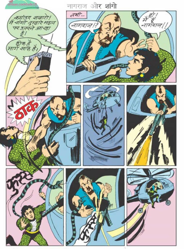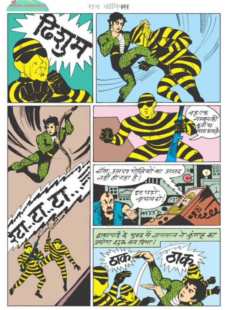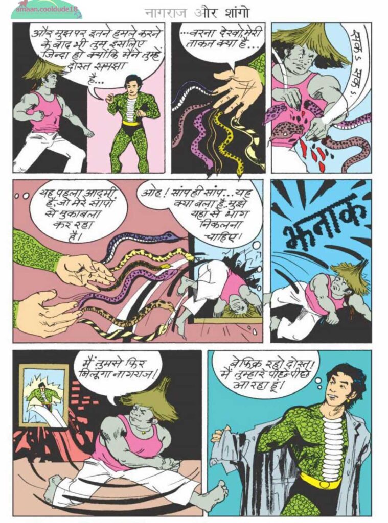 कॉमिक्स का शुरुआती हिस्सा पूरी तरह एक्शन से भरा है। शांगो की ताकत इतनी है कि वह अपनी उंगलियों से दरवाजे काट देता है और नागराज को कड़ी टक्कर देता है। नागराज, जो अपनी सांपों की शक्ति और मार्शल आर्ट्स के लिए जाना जाता है, पहली बार ऐसे इंसान से लड़ रहा था जो उसके जहर से प्रभावित नहीं होता।