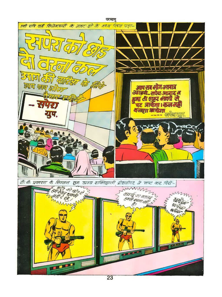 The snake charmer tries to escape in a private plane, but this is where the powers of Parmanu can be seen in a spectacular way. He uses his ‘power-rays’ (Energy Lasso) to clamp the flying plane and force it to land (p. 8). The arrest of the snake charmer is shown as a major victory of the law, but this victory is not going to last long.