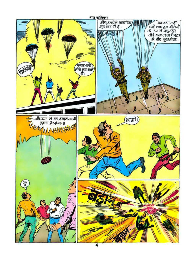 The Police Commissioner and D.C.P., along with a heavy police force led by Sathe, surround the Crystal Building from all sides. The strategy and preparation of the police are well shown in the initial part of the story. Landing commandos by parachute from a helicopter and carrying out a complete siege from below fills the readers with tremendous thrill. There is rapid firing from the terrorists, and they even use hand grenades. Seeing the situation worsening, Parmanu finally enters.