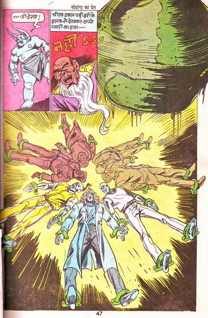 All the threads join together in the climax of the story. It is revealed that the creator of the “phantom robbers” and other monsters is none other than the notorious scientist Doctor Devil, who plans to rule the world together with the occultist Elephanta. Doctor Devil controls the spirits by resorting to science, while Elephanta exercises his tantric powers. Their biggest weapon is Thodanga, whom they send to wreak havoc in the world.