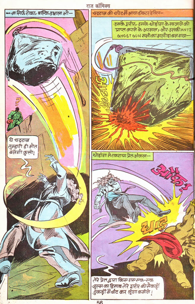 Villains (Doctor Devil and Elephanta): This comic gives us not one but two main villains, who create a deadly combination. Elephanta symbolizes ancient occultism and dark powers, while Doctor Devil symbolizes the misuse of modern science. Inventions such as Doctor Devil’s “Anti-Ghost Powder” show that he understands the powers of Phantom Uncle and is capable of countering them. The pair give an interesting dimension to the story, where superstition and science combine to cause destruction.