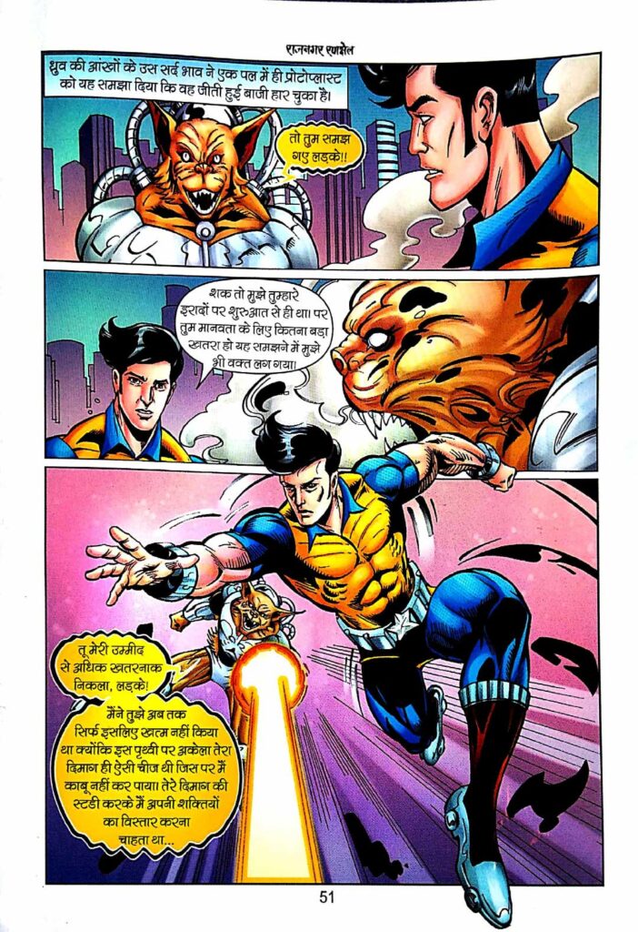 इस अंक के एक्शन सीन सिर्फ शारीरिक टकराव तक सीमित नहीं रहते, बल्कि उनके भीतर मानसिक और भावनात्मक गहराई भी मौजूद है। ध्रुव और ध्रुव ह्युमनॉइड के बीच की लड़ाई एक ऐसा युद्ध है, जहाँ नायक को अपने ही जैसे कौशल और सोच से लड़ना पड़ता है। दूसरी ओर, रोबो और स्टील की सेनाओं के बीच की भिड़ंत दो विशाल मशीनी ताकतों की भीषण टक्कर को दिखाती है। फर्नेस और हैमर का हमला कहानी में पुरानी दुश्मनी को एक नए और रोमांचक मोड़ पर ले आता है, जबकि प्रोटोप्लास्टा और ध्रुव के बीच होने वाली ब्रेन मैपिंग की मानसिक जंग आगे की पूरी रणनीति तय करने वाला अहम मोड़ बन जाती है।