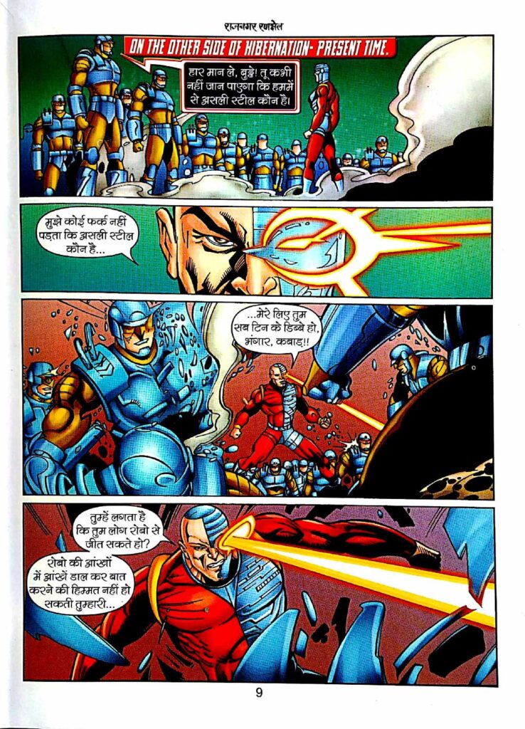 पन्ना संख्या 11 पर स्टील की विशाल मशीनी सेना और उसके सामने खड़े अकेले रोबो का दृश्य गहरी छाप छोड़ता है।